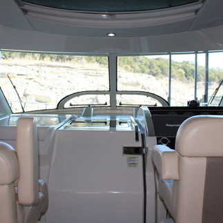 2012 Sea Ray 450 Sundancer – A Beauty! Powered by twin Cummins QSB 480 HO diesels, 457/441 hours. Zeus pod drives. Mercury Marine SmartCraft joystick control. Hydraulic trim tabs. Onan 11.5 kW generator, 401 hours. Battery bank with ProMariner battery chargers and switches. 50 AMP shore power with retractable 40 ft. cord. Electric windlass. Raymarine GPS, chartplotter, radar. VesselView display. TracVision digital satellite system. Full isinglass and canvas enclosure with AC cools the cockpit in hot summer months! Cockpit seating includes a bolstered double helm seat, a double companion seat, and wrap around sofa. Entertain using the refreshment center - sink, refrigerator, and electric grill. Add to that the dining table, flatscreen TV, Sony stereo system, and retractable sunroof! Extra-large swim platform. Transom shower for a hot or cool water rinse. Step up from the cockpit onto the side passageway to the bow where there are sun pads for great views and relaxation!